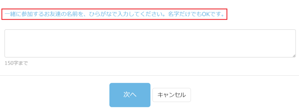 その場合は、代表の方が予約し、参加人数を選択したうえで、お友達の名前を備考欄にご記入ください。